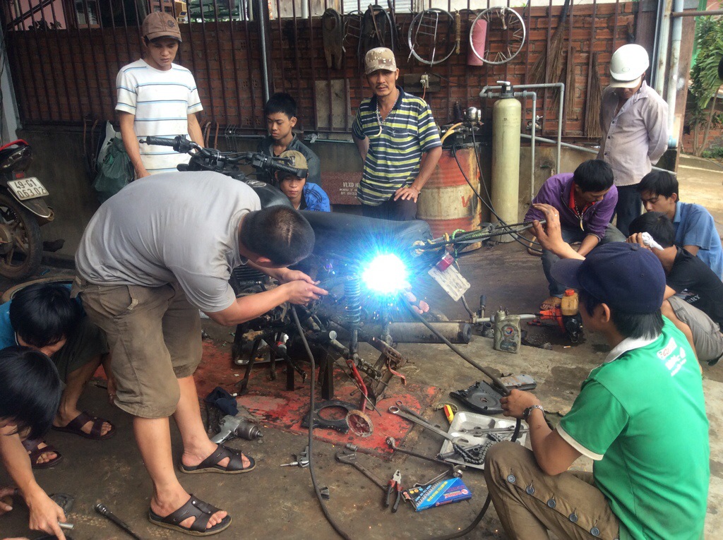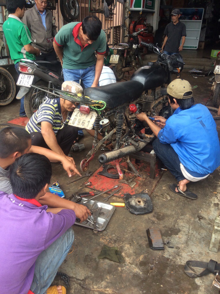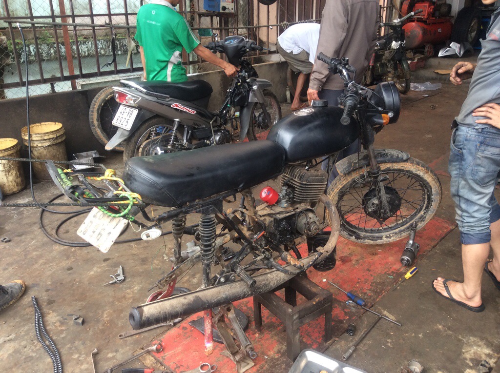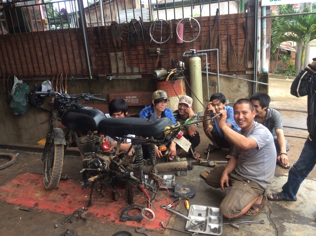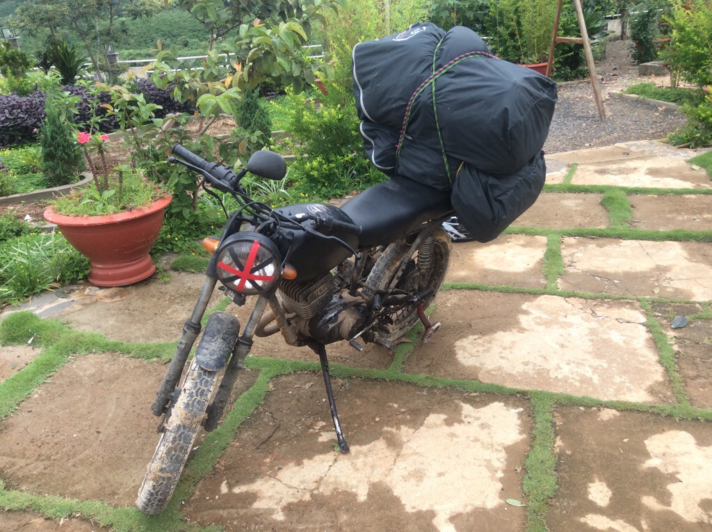 We finally started to leave the towns behind us and head into the country. With our first few brief mountain passes Ivan being the great comrade that he is decided to set the bar for new achievements. Whilst trying frantically to catch Kim and Blake to advise them that they had just lost some cargo (a poncho that Ivan collected with his front tyre) Ivan exploded against my leg, I glanced behind me expecting to see a loose ocky strap, instead spied my luggage disappearing downwards. I quickly pulled over and flagged down the others to find Ivan had dropped his battery straight on the ground. Two seconds later Mitch arrived and four seconds later the rain like nothing else pelted down. In the two second Mitch had to view Ivan his face and dreams or reaching Hanoi faltered. Ivan was passing out oil and fuel everywhere. We simply stood on the side of the road under the roof of a road side stall and house and Mitch couldn’t even speak. Yet again the Belorussian had failed, and this time seriously. Blake and Kim finally joined us as the rain took on a fresh intensity.