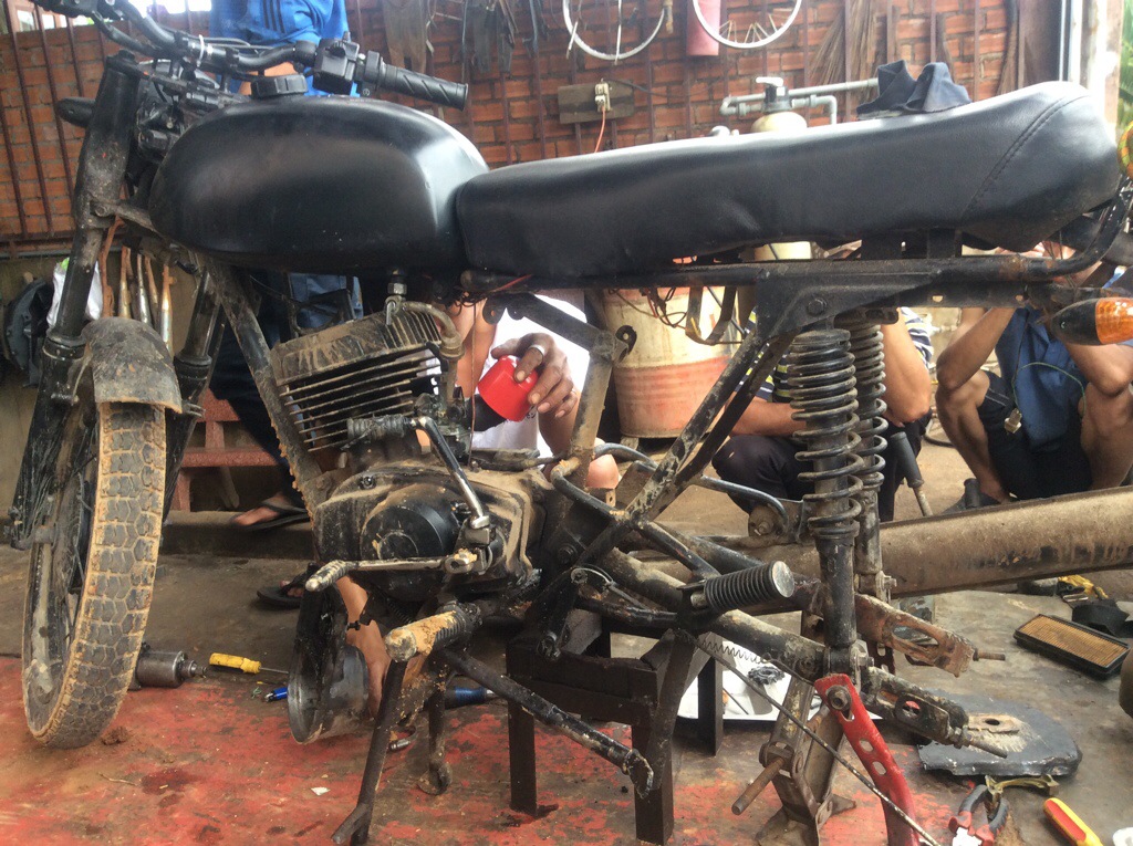 A 20 minute pit stop had it re-attached, an oil change completed and new problems identified. Apparently the gearshift/kick start array is experiencing oil leaking difficulties – a problem that is still not resolved.