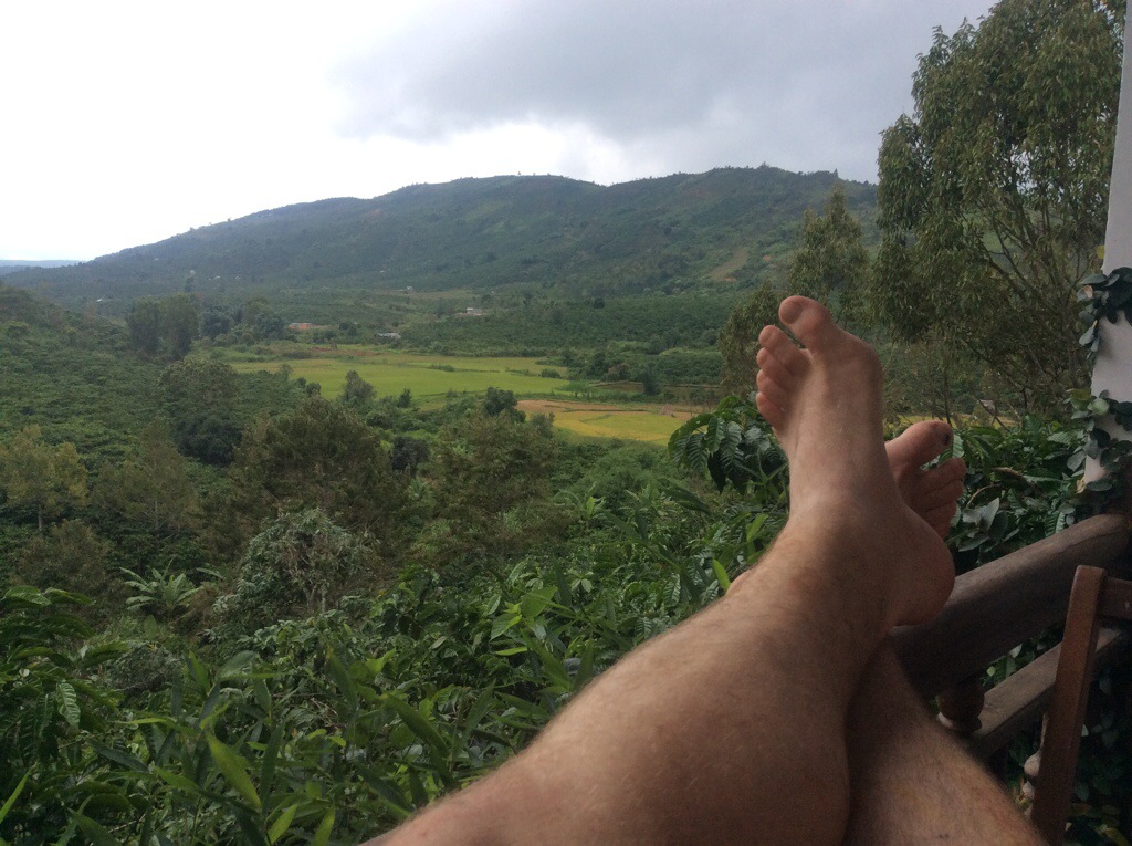 A final twisty hill climb up a rapidly deteriorating roadway called Khe Sanh road saw us up the the plateau, looking over the town. A brief map consultations and we pulled up at the hotel, where Kim and Jack had only recently arrived.
